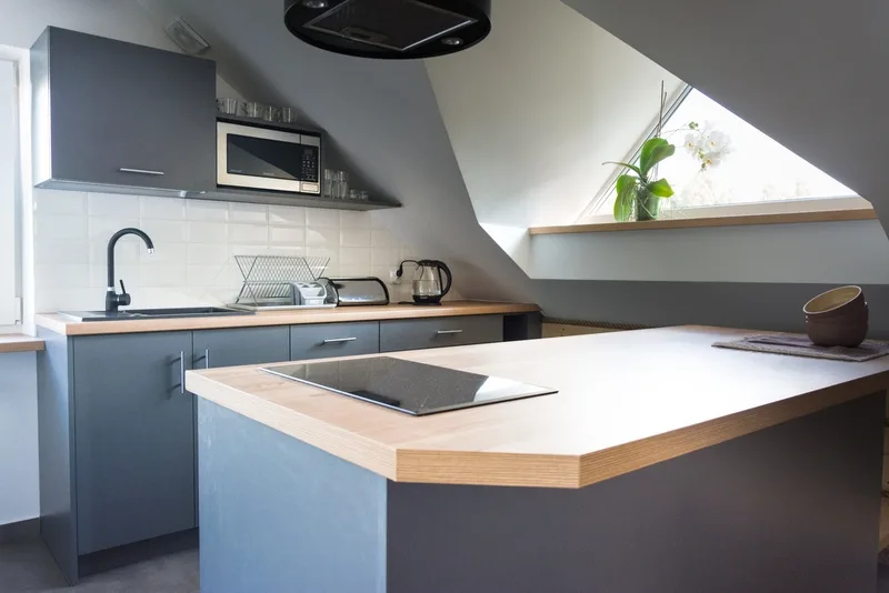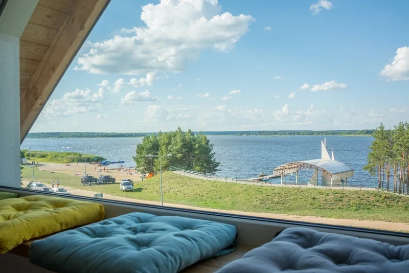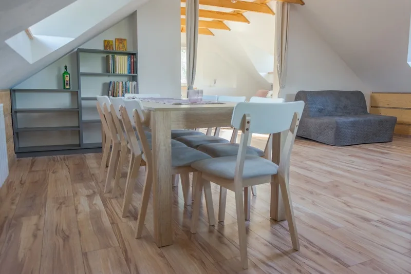 Apartament na poddaszu z pięknym widokiem na jezioro i plażę, aneksem kuchennym, łazienką i klimatyzacją. W apartamencie znajdują się: łóżko dwuosobowe, cztery pojedyncze łóżka, rozkładana sofa (dzięki czemu możliwy jest również wynajem dla 8 osób), a także telewizor. Aneks kuchenny wyposażony jest w lodówkę, zmywarkę, piekarnik, mikrofalówkę, płytę indukcyjną dwupalnikową i zlew.