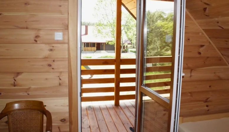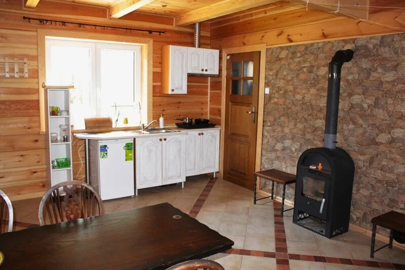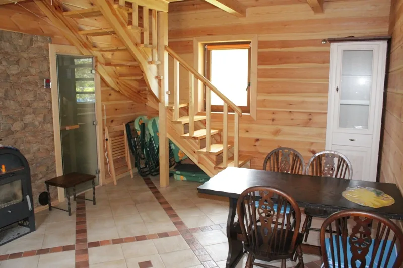 Na parterze znajdują się: jadalnia, sauna, łazienka, niewielki aneks kuchenny wyposażony w dwupalnikową kuchenkę indukcyjną, lodówkę podblatową i mikrofalówkę. Na piętrze zlokalizowane są: sypialnia z dwoma łóżkami pojedynczymi, sypialnia z łóżkiem podwójnym, rozkładaną małą sofą i balkonem.