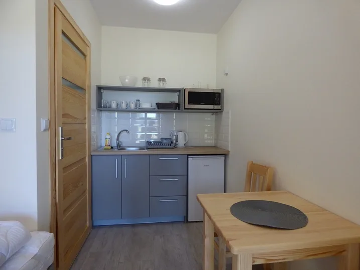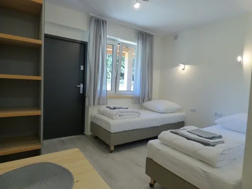Pokój z prywatną łazienką, w którym znajdują się dwa pojedyncze łóżka z możliwością łączenia, telewizor oraz mały aneks kuchenny wyposażony w lodówkę podblatową, mikrofalówkę i zlew.