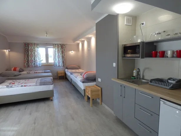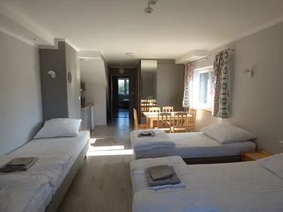 Pokój z prywatną łazienką zlokalizowany na I piętrze. W pokoju znajduje się pięć pojedynczych łóżek, telewizor oraz mały aneks kuchenny wyposażony w lodówkę podblatową, mikrofalówkę i zlew.