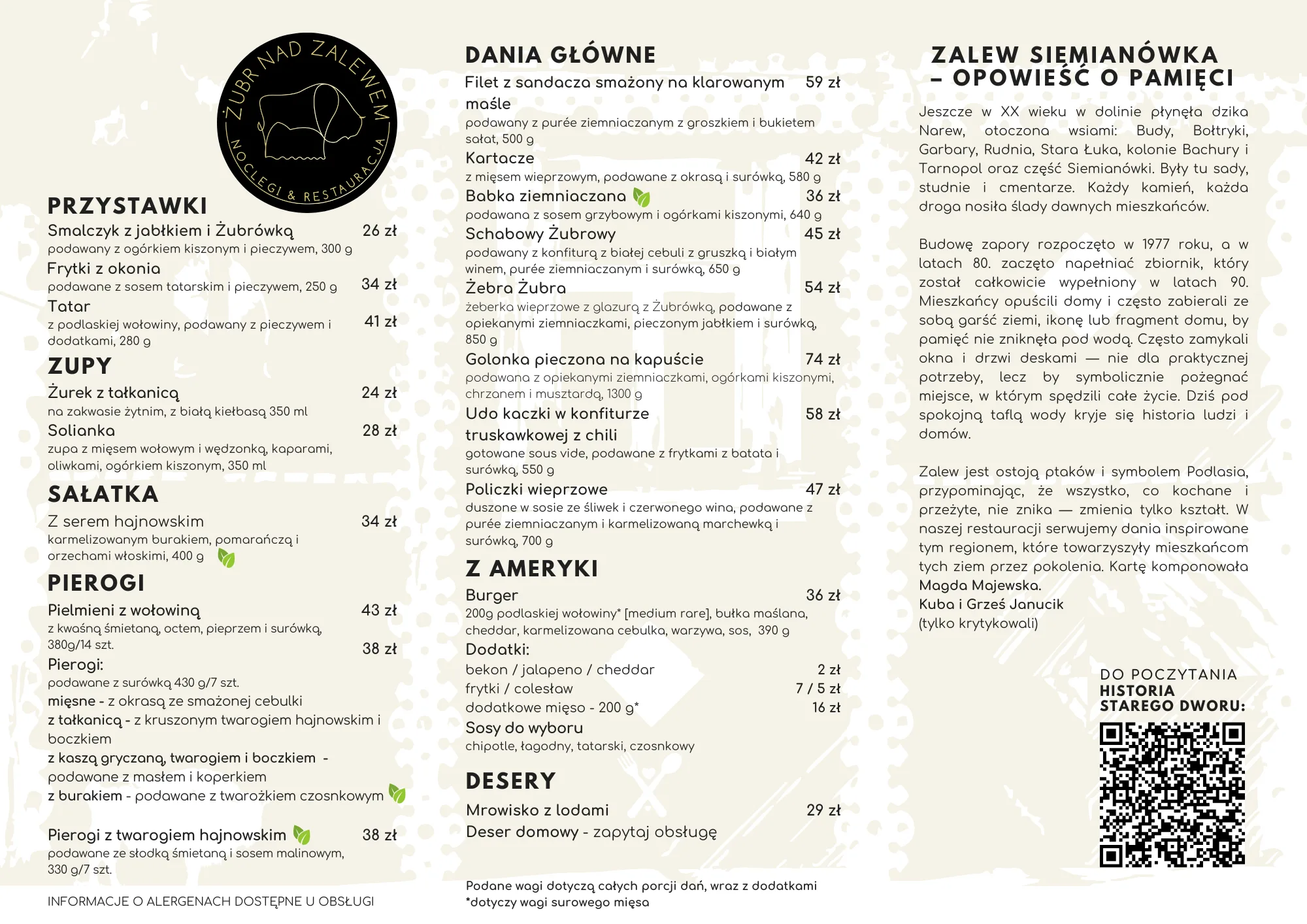 Menu restauracji Żubr nad Zalewem to połączenie kuchni polskiej i lokalnych produktów z Podlasia. Oferujemy dania obiadowe, przystawki, desery oraz szeroki wybór napojów.